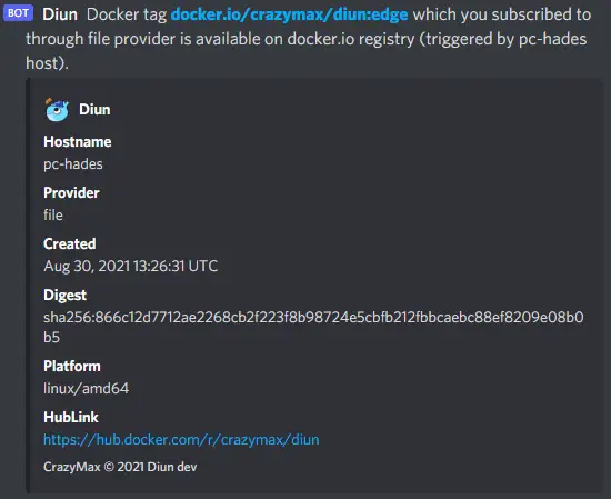 This will notify you in all supported applications, just like what we have received on Discord: the hostname, provider, the date it was created, platform and the Docker Hub link.