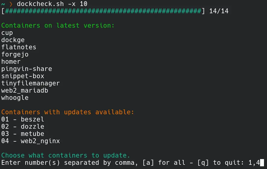 You get a numbered list of containers with updates available. Pick which ones to update, or type a for all. Clean and simple.